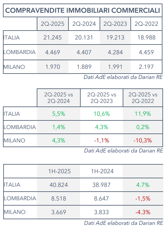 L’analisi delle compravendite di immobili commerciali mostra un aumento nel numero delle transazioni rispetto allo stesso trimestre del 2024 (+5,5%), tuttavia, complice un primo trimestre meno positivo, il primo semestre 2025 registra un incremento inferiore rispetto ai primi mesi del 2025 in ambito italiano (+4,3%) e addirittura un andamento negativo per le compravendite avvenute in Lombardia e nel capoluogo.